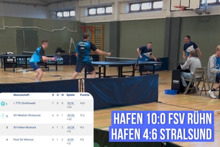 Fazit: Wir stehen also zwischenzeitlich auf Rang 3 von 12 in der höchsten Liga in M-V – wer hätte das vor der Saison gedacht? Wir sind damit sehr zufrieden und wollen diese Euphorie im Verein gerne weiter mitnehmen in die weiteren vier Saisonpartien. Gleich nächste Woche geht es zum Tabellenführer, dem TTC Greifswald und dessen Zweiter, die im Mittelfeld steht. Am Ende des Jahres kommen Parchim und Waren zu uns. Am 20.12. wollen wir unseren Zuschauern dann unbedingt auch wieder einen Livestream und ein großartiges Erlebnis in der Halle präsentieren. Wir hoffen ihr seid wieder dabei – Bis dann!